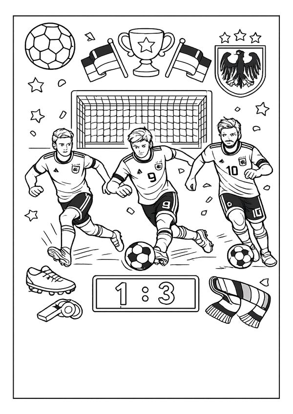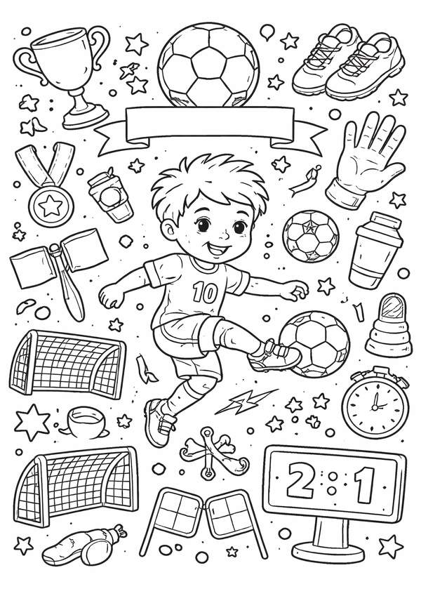 Ein vielseitiges Fussball-Ausmalbild mit sportlichen Symbolen – ideal für Fussball-Malvorlagen und kreative Stunden.