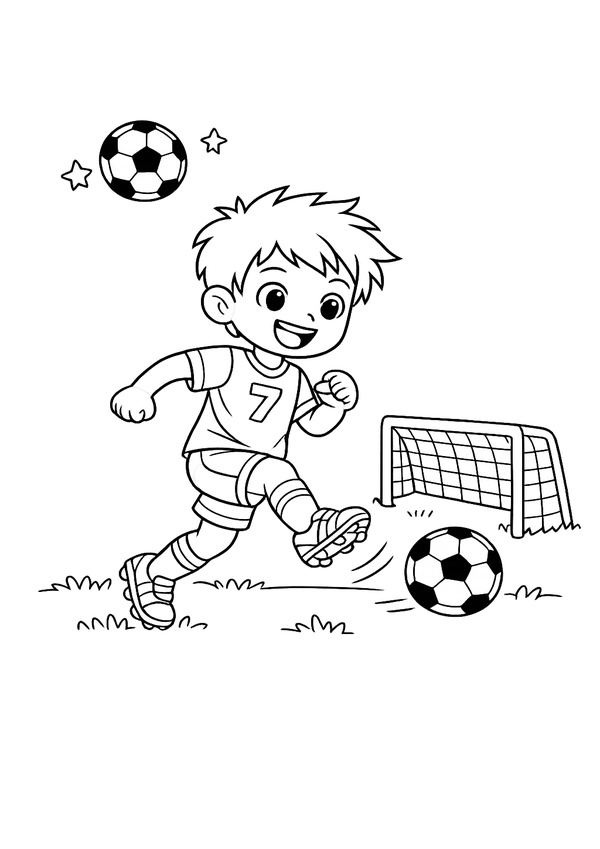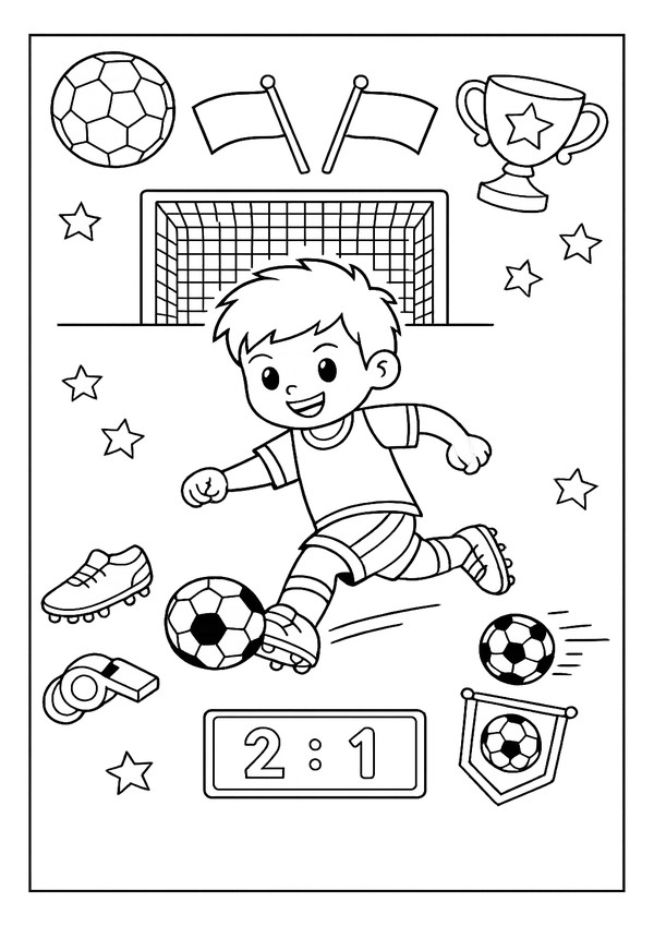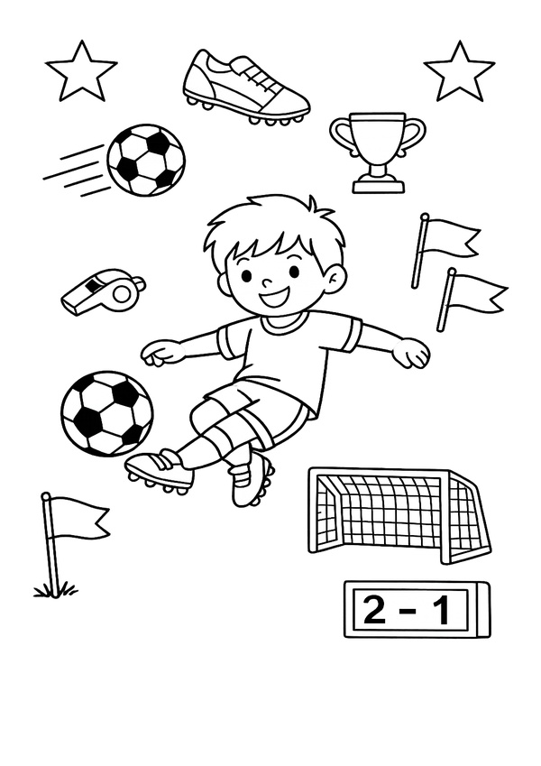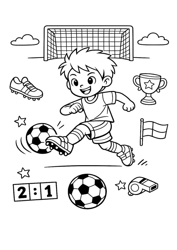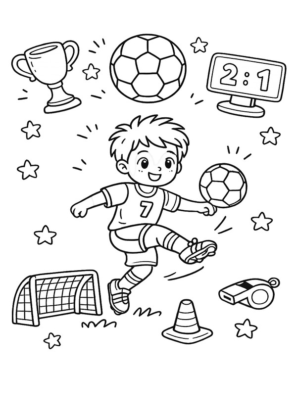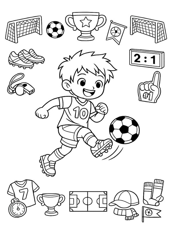 Ein kindgerechtes Fussball-Motiv mit Trainings-Elementen – ideal für Malspaß im Verein und zu Hause.