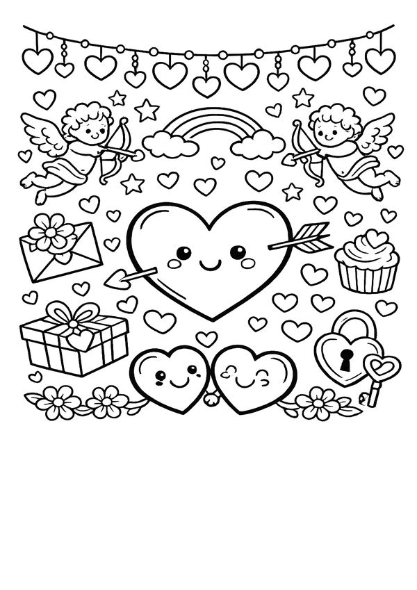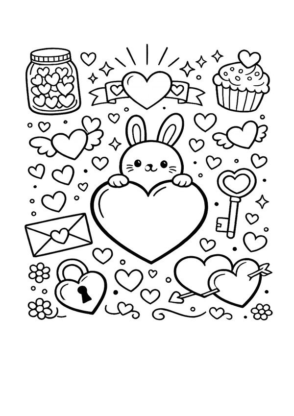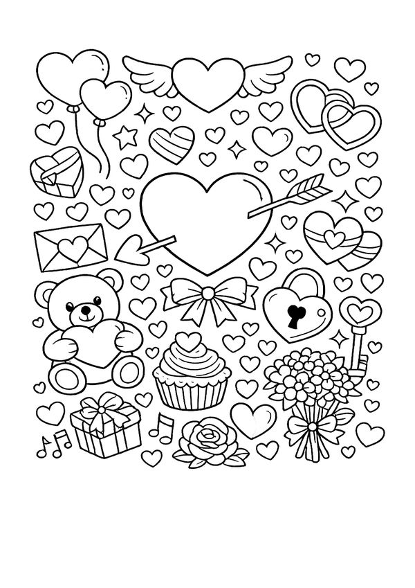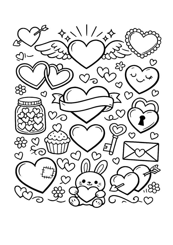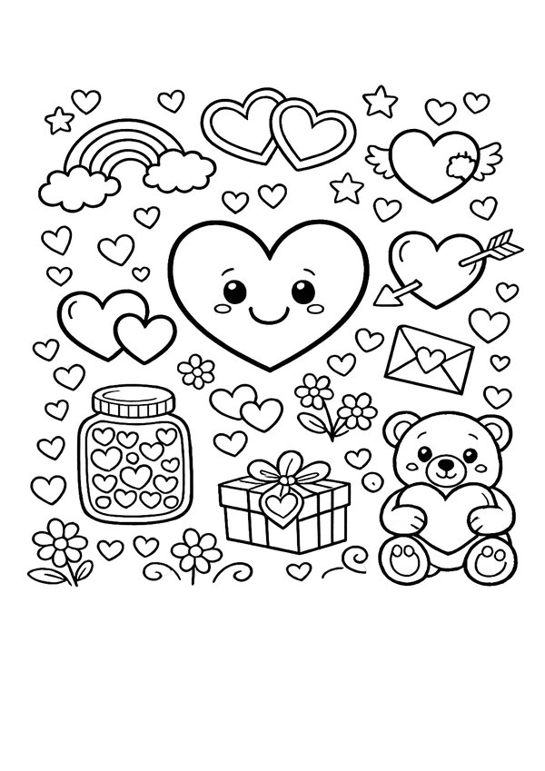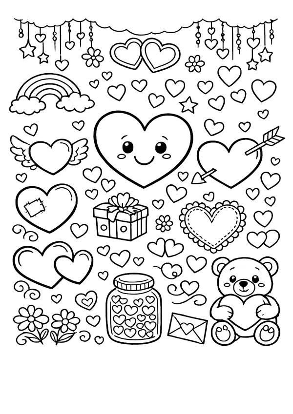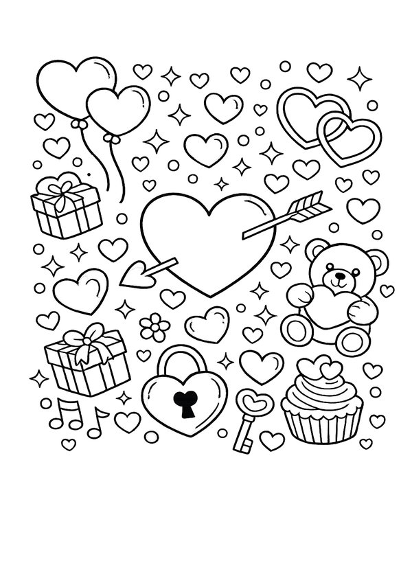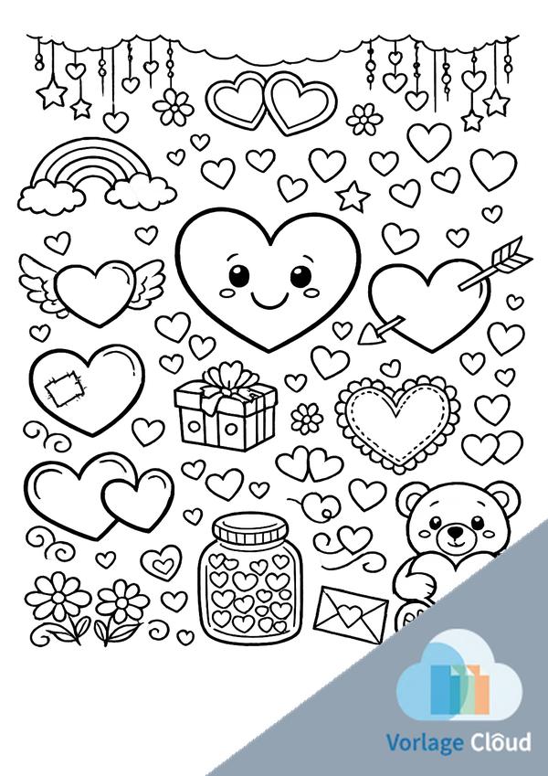 Viele Motive in einem Bild – romantische Symbole zum Ausmalen mit Herzen, Sternen und Deko.