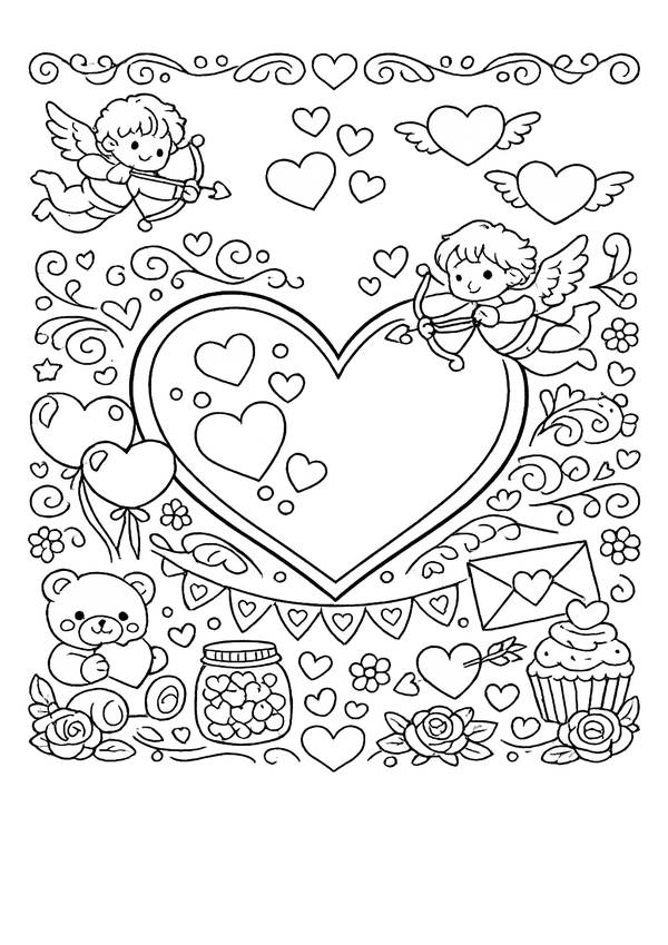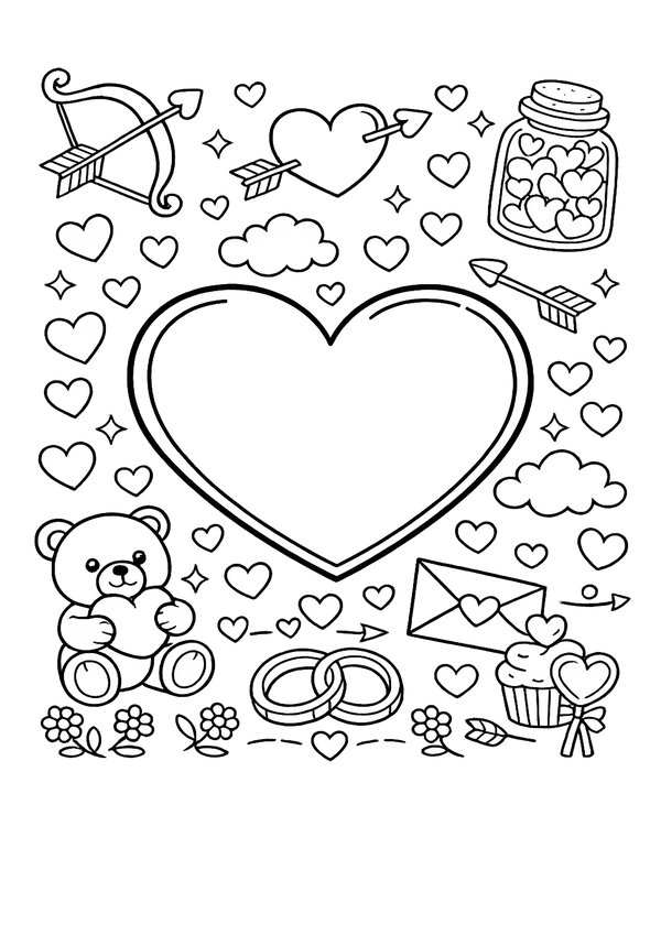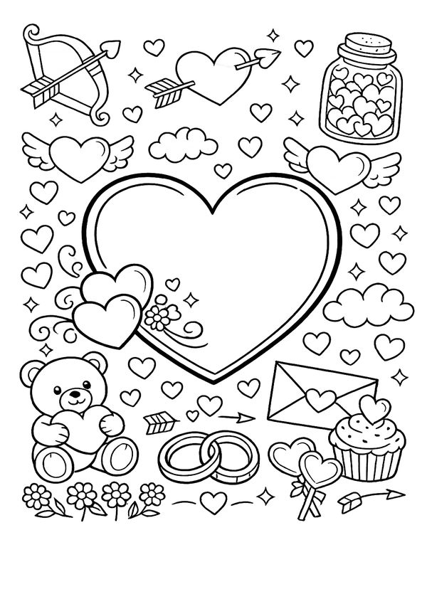 Herz-Design mit süßen Extras – Valentinstag Ausmalbild mit vielen kleinen Symbolen.