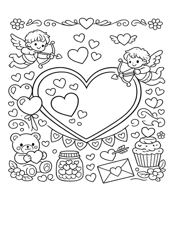 Mit Engelchen und Herzrahmen – perfekt für Liebesgrüße zum Ausmalen.