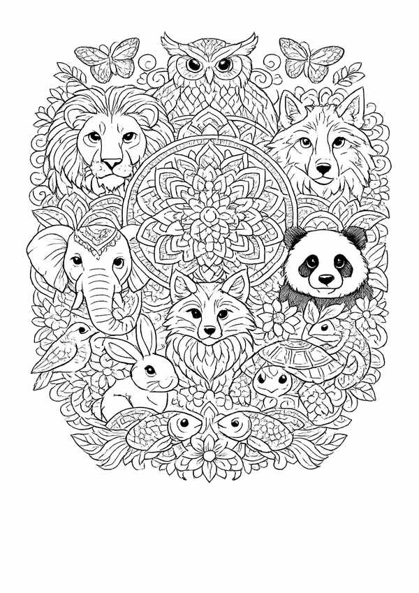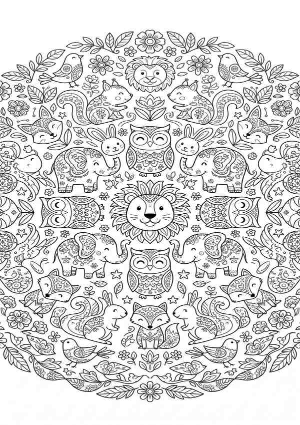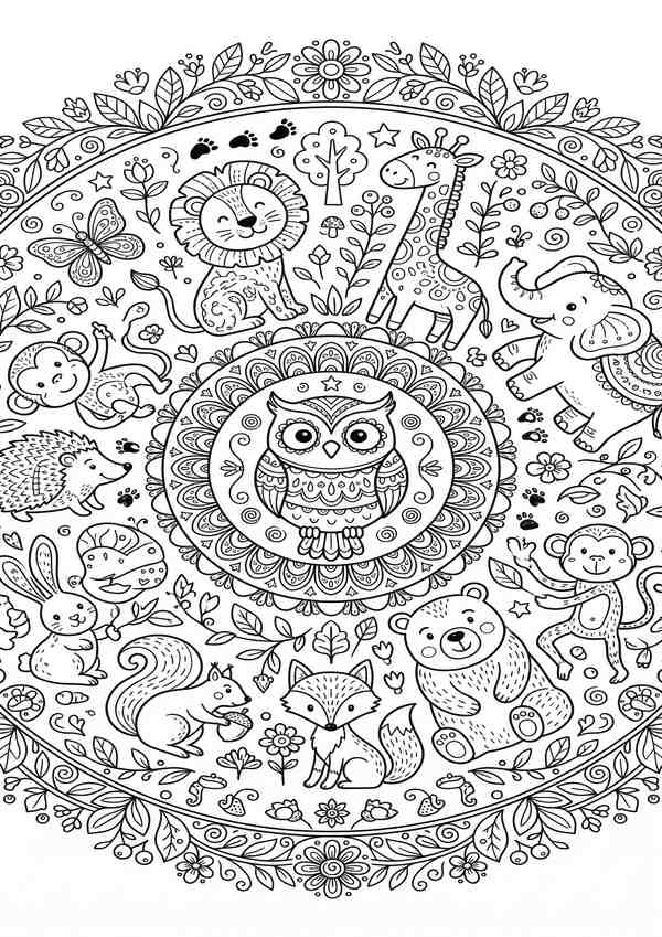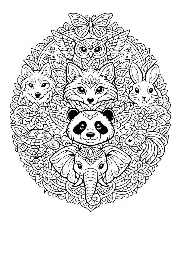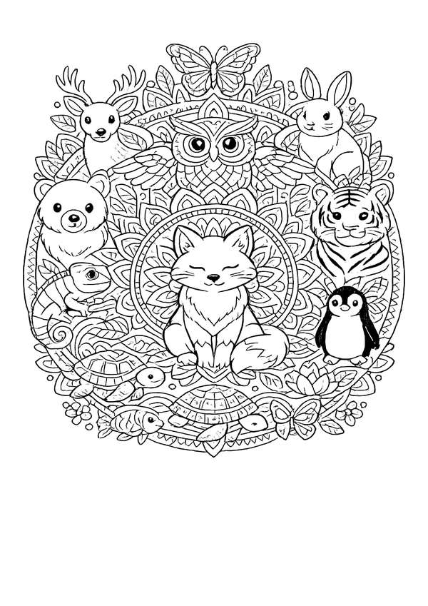 Detailreiches Tier-Mandala zum Entspannen – viele Tiere im Mandala und feine Linien für ruhige Ausmalmomente.
