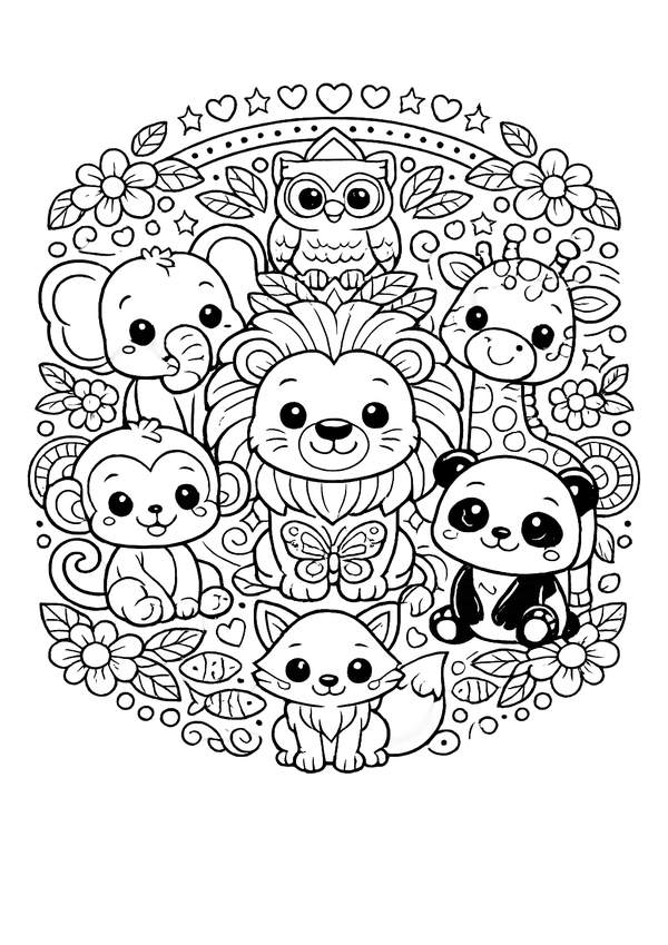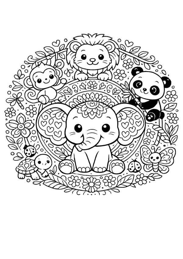 Tiergruppe im Mandala-Rahmen – fröhliches Design mit klaren Formen und hübschen Details.