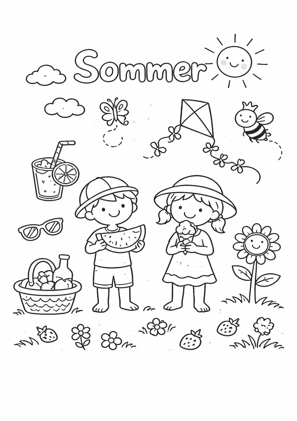 Das Bild zeigt zwei Kinder mit Sommerhut, Picknickkorb, Drachen, Getränk und Blumen in einer freundlichen Szene. Ideal für alle, die fröhliche Sommerfiguren ausdrucken und ausmalen möchten.