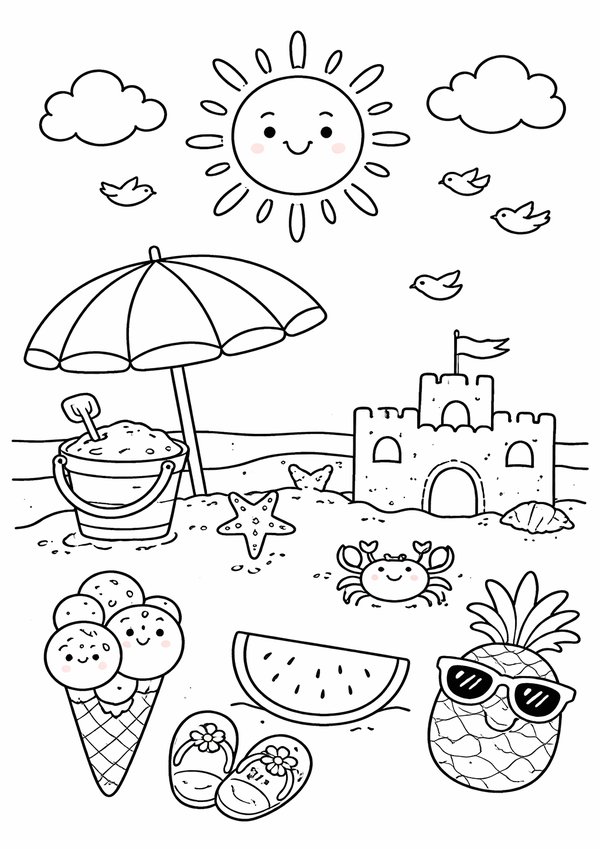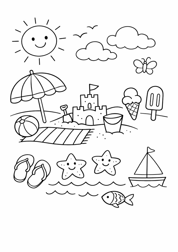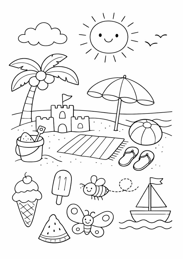 Die klaren Umrisse und vertrauten Ferienobjekte machen dieses Ausmalbild zu einer vielseitigen Wahl für Schule, Zuhause oder den Urlaub.