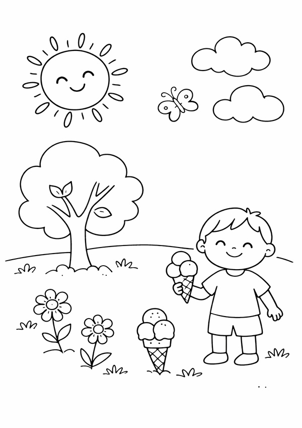 Ein ruhiges Sommermotiv mit Kind, Eis, Baum, Blumen und Schmetterling. Die Szene eignet sich hervorragend, um freundliche Naturbilder bunt zu gestalten.