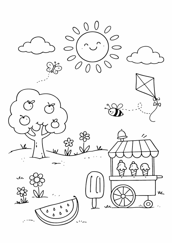 Diese Vorlage kombiniert Apfelbaum, Eiswagen, Drachen, Wassermelone und Blumen zu einer abwechslungsreichen Szene voller Sommerlaune. Perfekt für bunte Ferienmotive mit vielen kleinen Details.