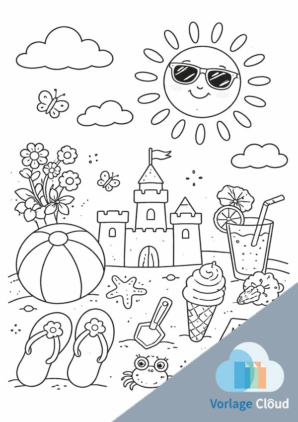 Die Vorlage verbindet einfache Linien mit vielen bekannten Ferienmotiven und eignet sich gut für kreative Sommernachmittage zu Hause oder im Unterricht.
