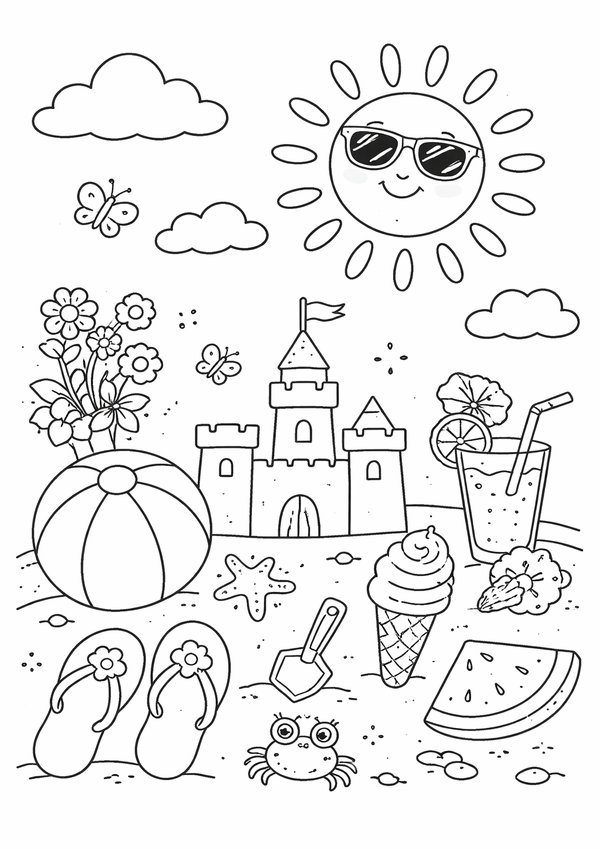 Das Motiv zeigt Sonne, Strandburg, Eistüte, Wassermelone und Muscheln in einer freundlichen Szene mit viel Platz zum Kolorieren. Besonders schön für einfache Sommermotive mit kindgerechtem Stil.
