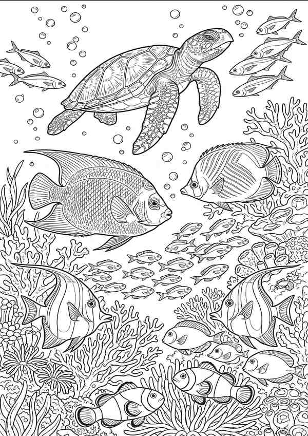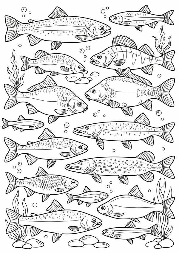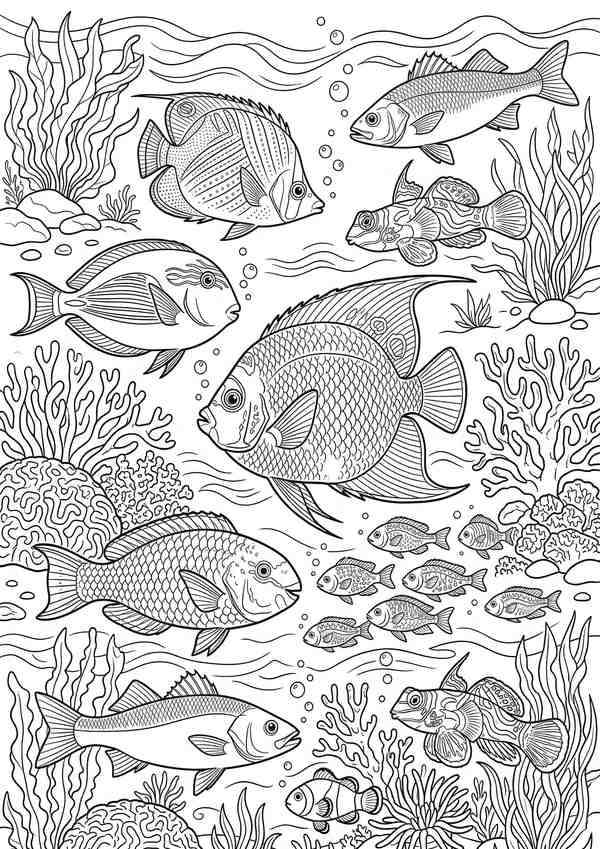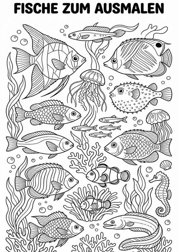 Detailreiche Malvorlage mit mehreren Fischen und Unterwasser-Elementen – ideal für ruhige Malmomente und feine Linienarbeit.