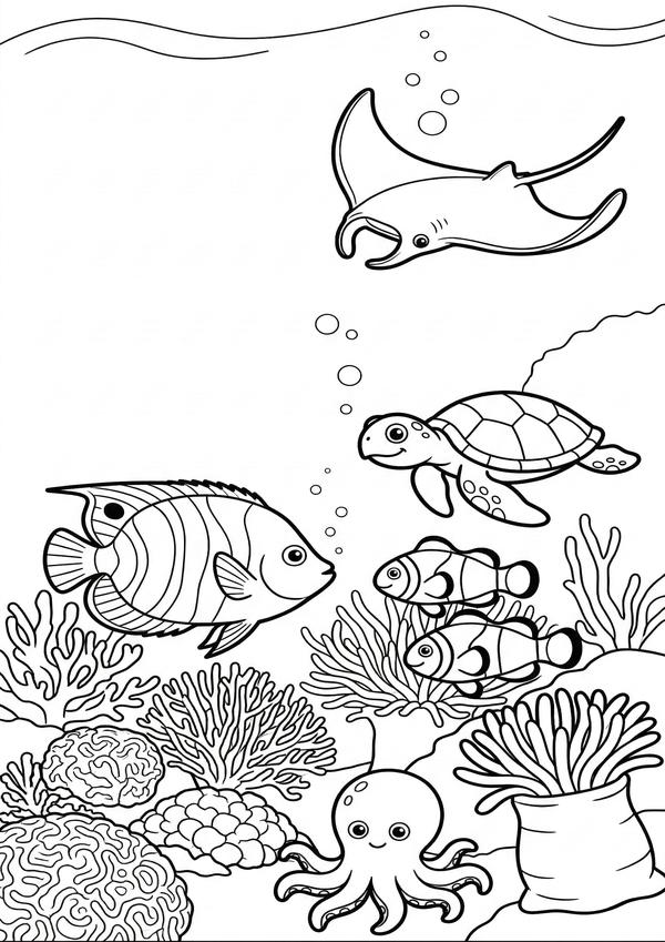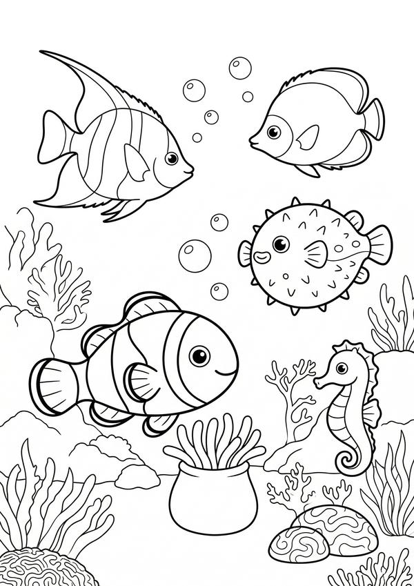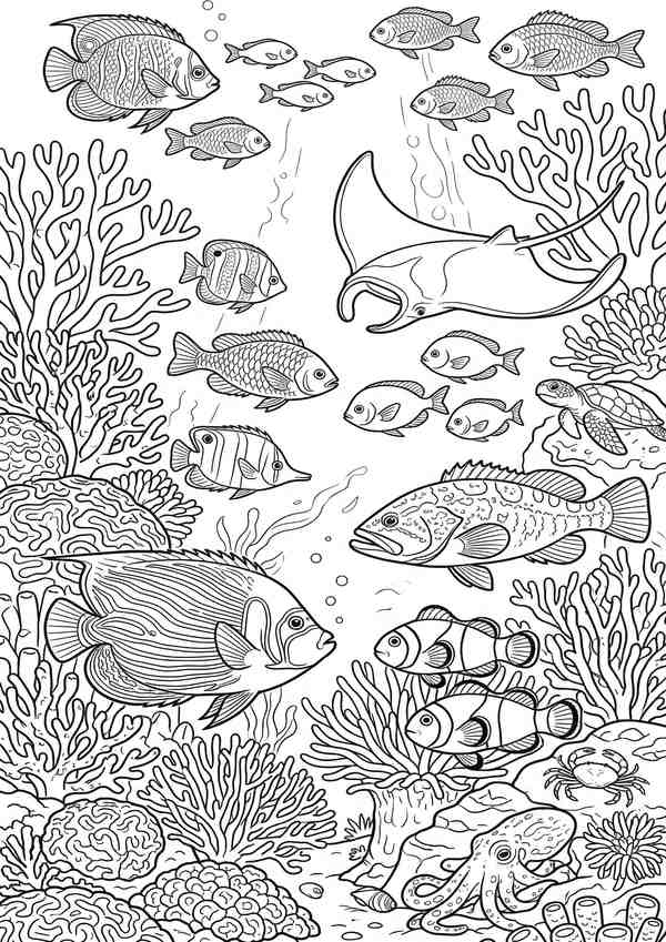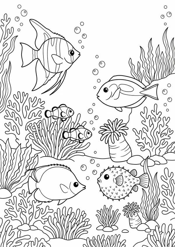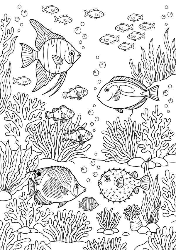Ausmalbild mit mehreren Fischen im Riff – ideal für Meerestiere ausmalen und kreative Projekte.