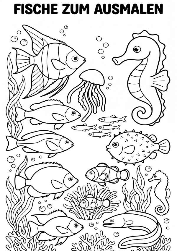 Fischbilder zum Ausmalen mit vielen Meer-Details – perfekt für lange Beschäftigung und Konzentration.
