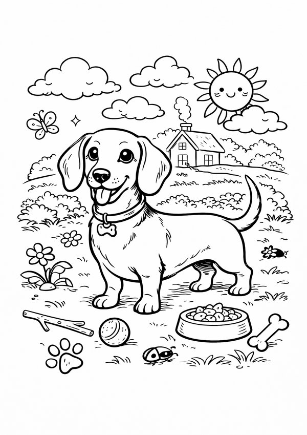 Fröhliches Dackel-Ausmalbild mit liebevollen Details – sorgt für kreativen Malspaß bei Kindern.