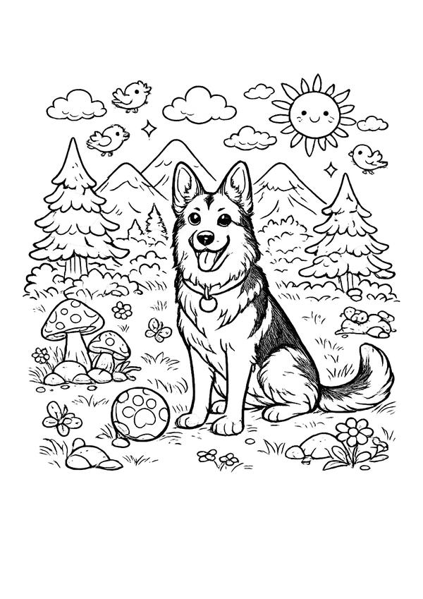 Detailreiches Ausmalmotiv mit Schäferhund in Berglandschaft – mit Bäumen, Wolken und Sonne für extra viel Ausmalspaß.