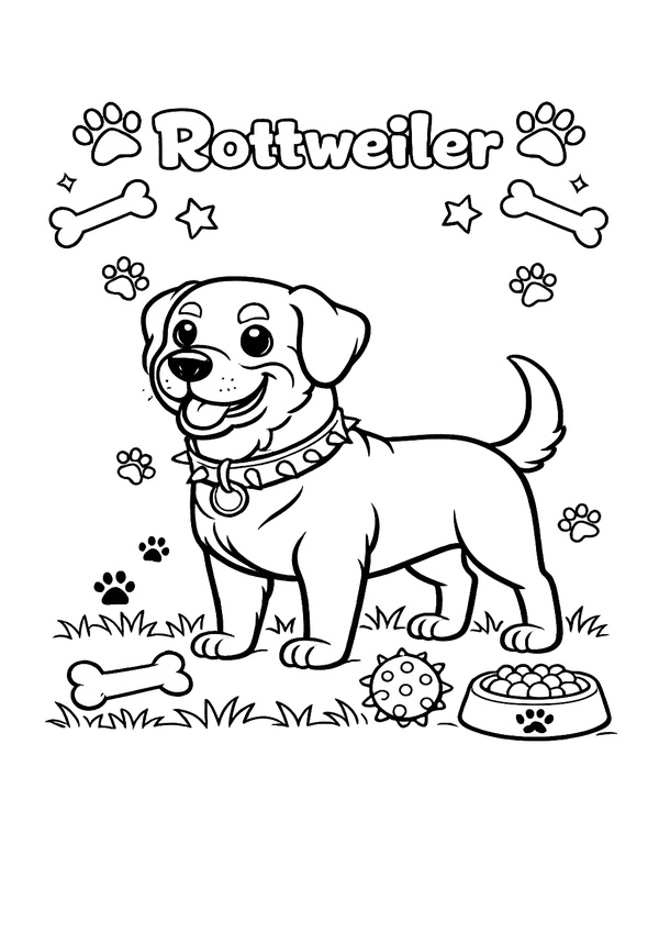 Verspieltes Ausmalbild mit Rottweiler, Pfoten und kleinen Details – extra viel zum Malen.