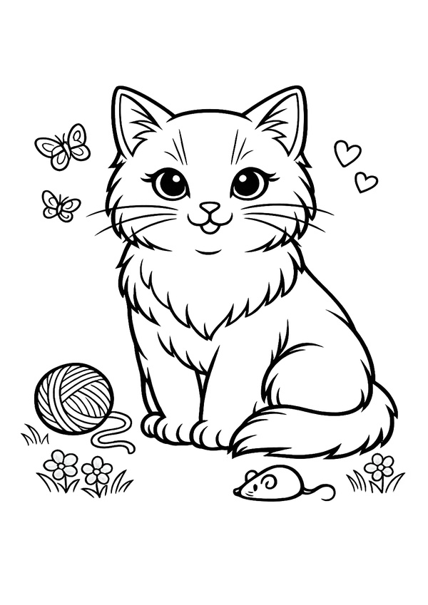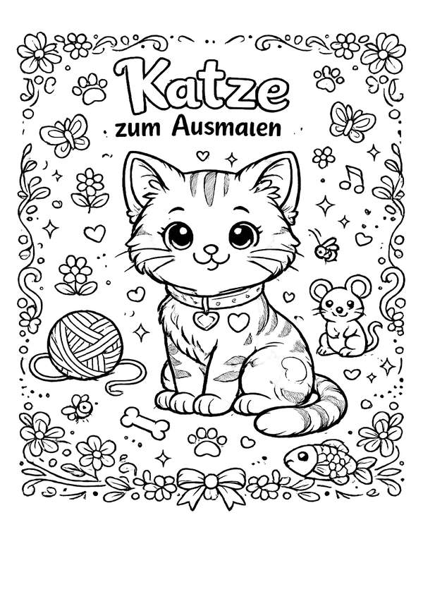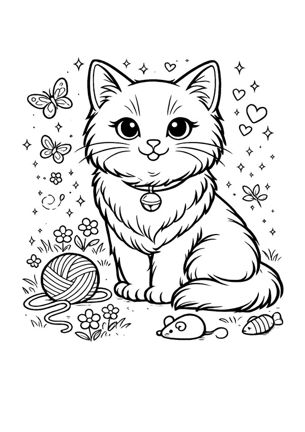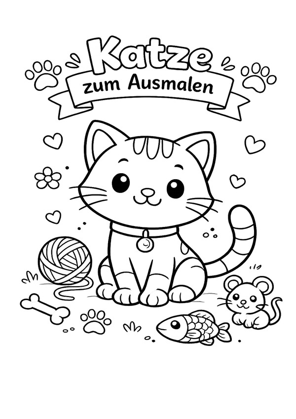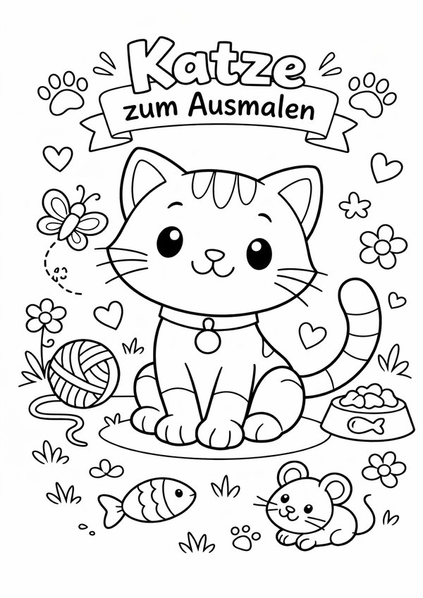 Verspielte Katze mit süßen Elementen – perfekt für eine entspannte Malpause.