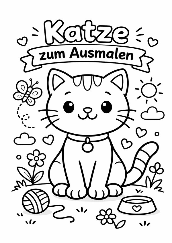 Katzen Ausmalbilder zum Ausdrucken mit schöner Deko – ideal als kleine Beschäftigung für Zwischendurch.