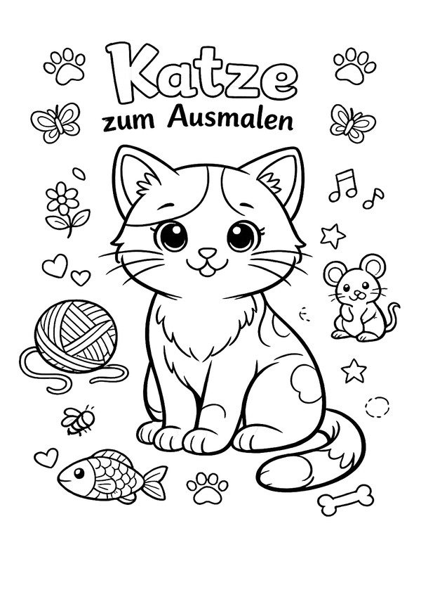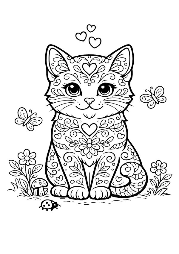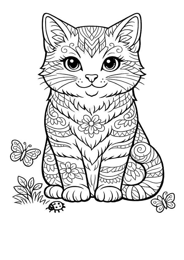 Niedliche Katze zum Ausmalen mit vielen kleinen Details – perfekt für Kinder, die gerne Motive mit Symbolen ausmalen.