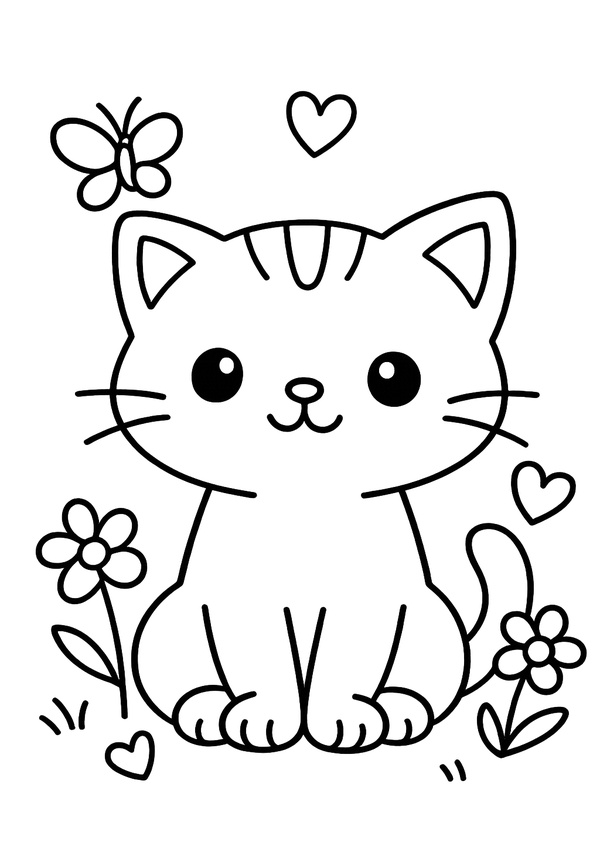 Einfaches Kätzchen mit Herzchen und Blumen – super als schnelle Malvorlage für Kinder.