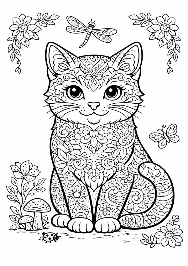 Detailreiche Musterkatze – ideal, wenn du gerne konzentriert ausmalst und viele Formen magst.