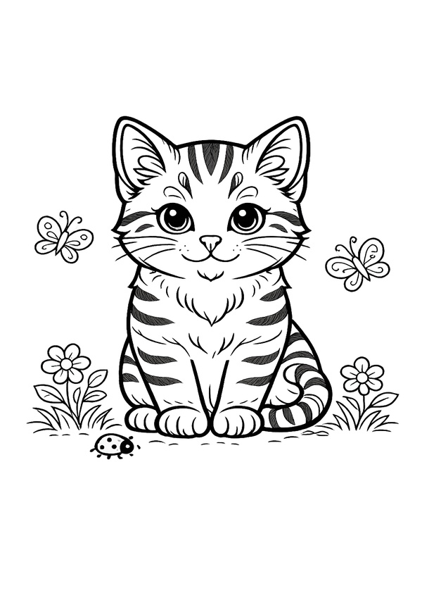 Katzenbilder zum Ausmalen mit Blumen und kleinen Elementen – klassisch, süß und leicht zu drucken.