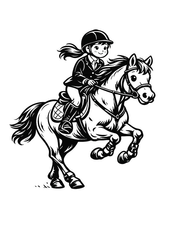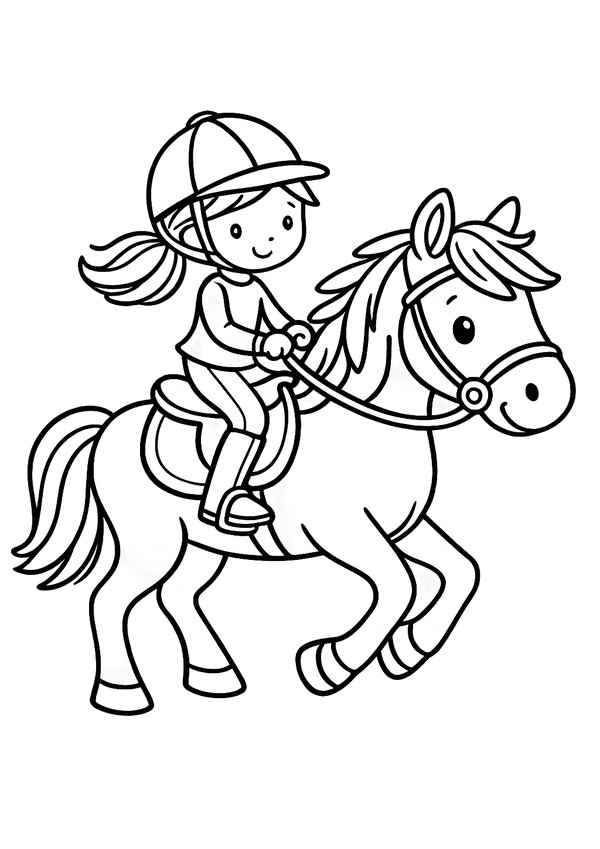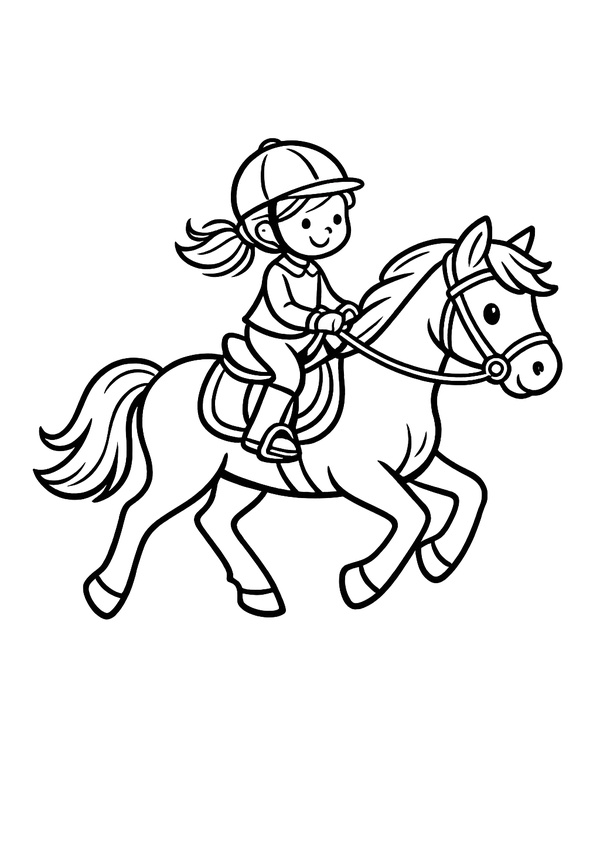 Ausmalbild im niedlichen Stil: Reiterin auf Pony – kindgerechtes Design mit großen Flächen zum einfachen Kolorieren.