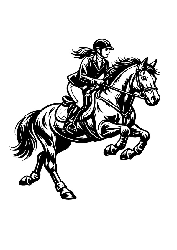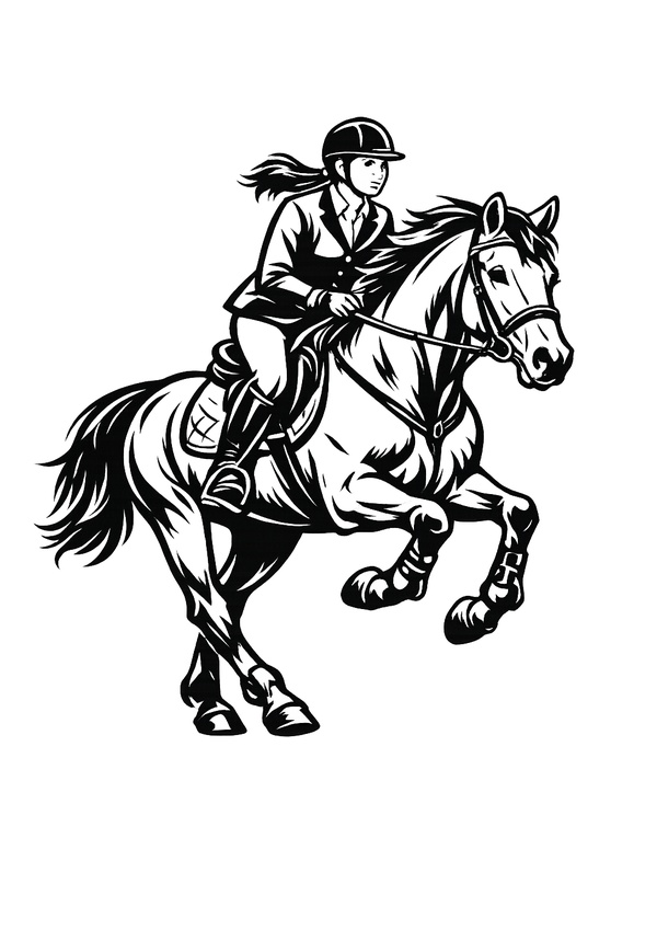 Dynamisches Pferd-mit-Reiterin-Motiv als Malvorlage – ein sportliches Motiv für alle, die Action und Bewegung beim Ausmalen mögen.