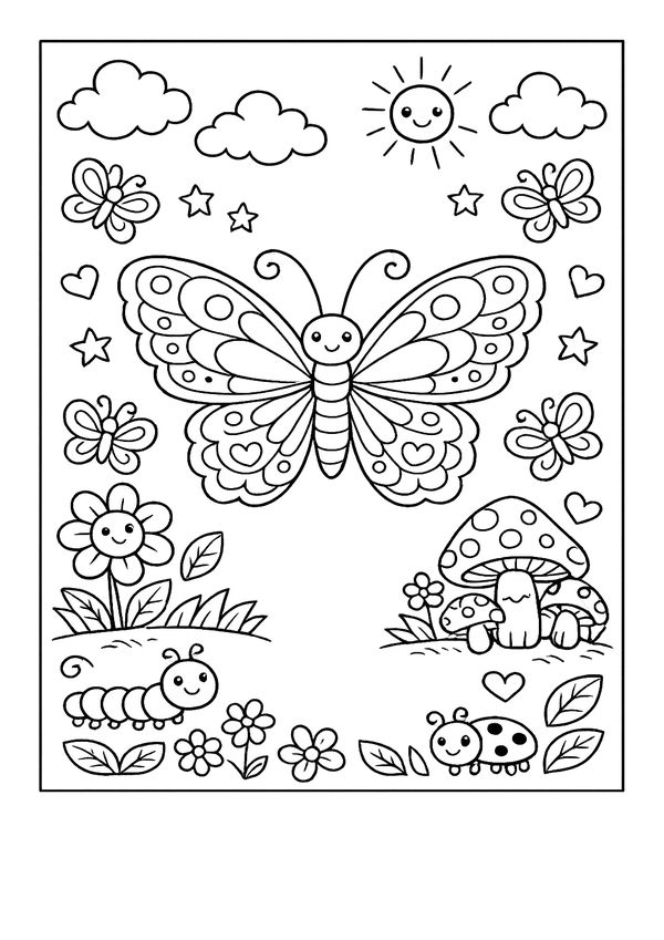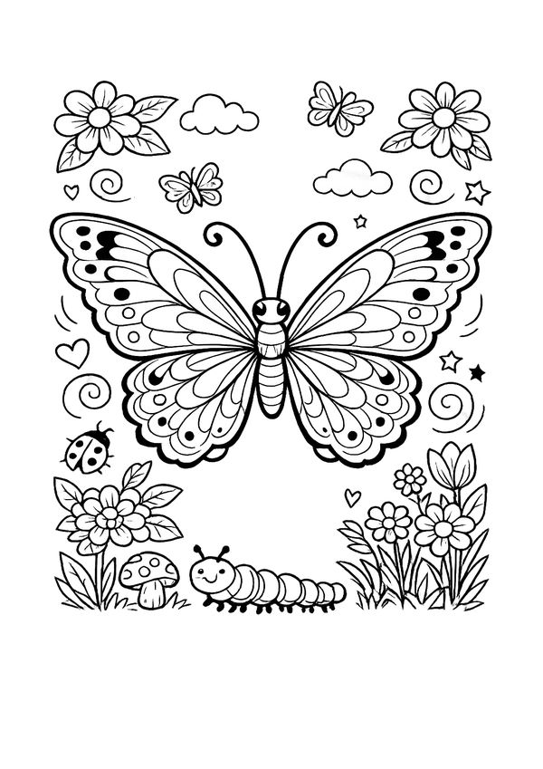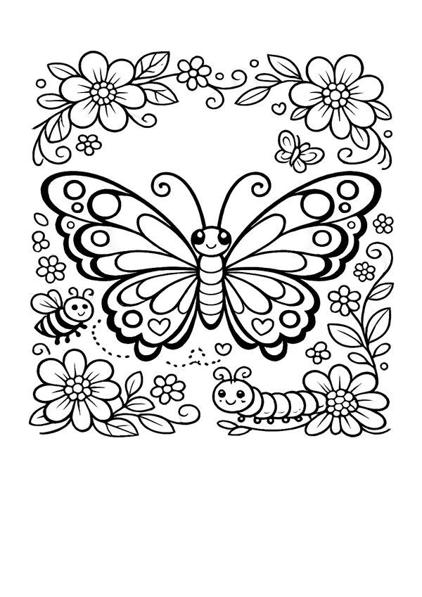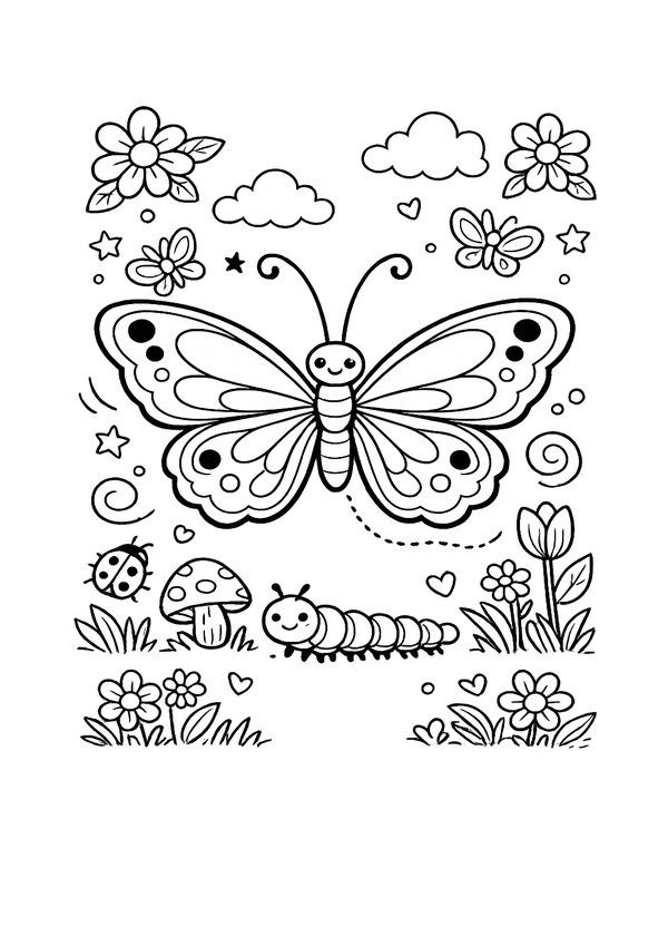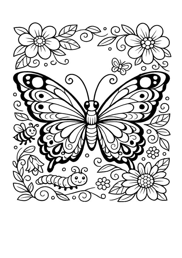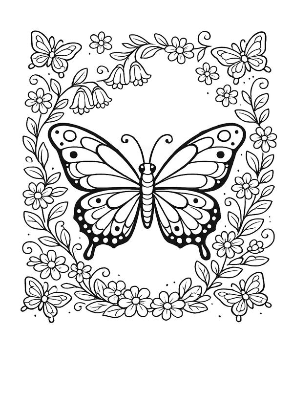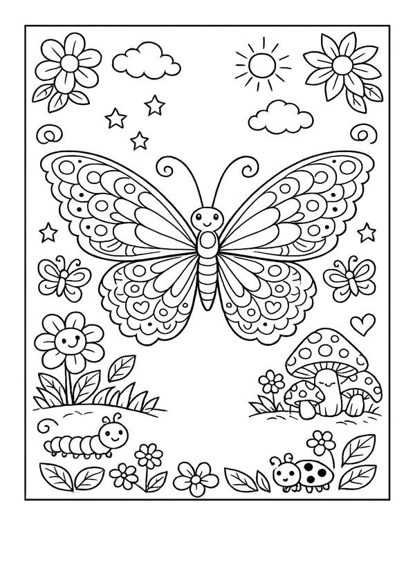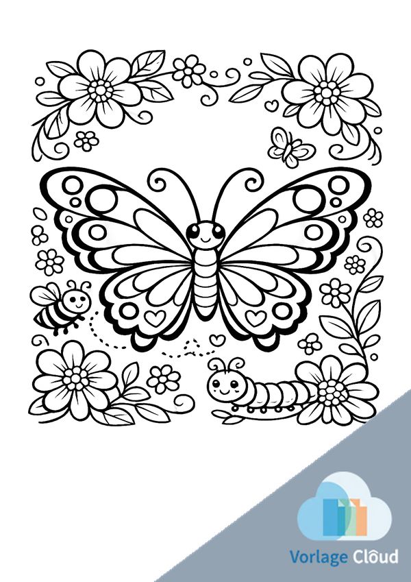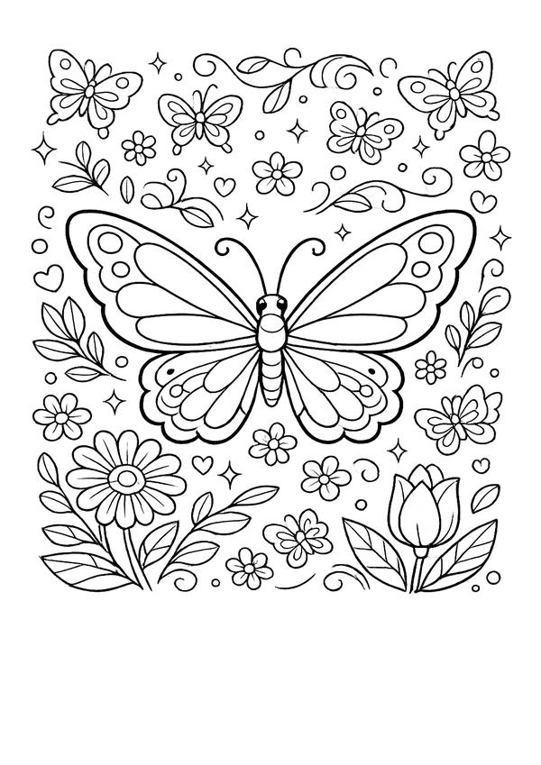 Ein fröhliches Motiv mit Natur-Details – süßer Schmetterling im Garten zum entspannten Ausmalen.