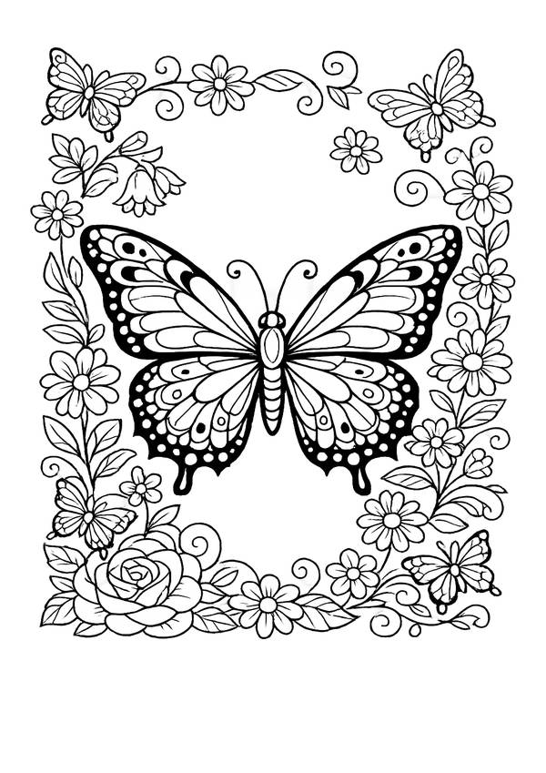 Mit dekorativem Rahmen und vielen Blüten – Blumenrahmen mit Schmetterling als schönes Ausmalbild.