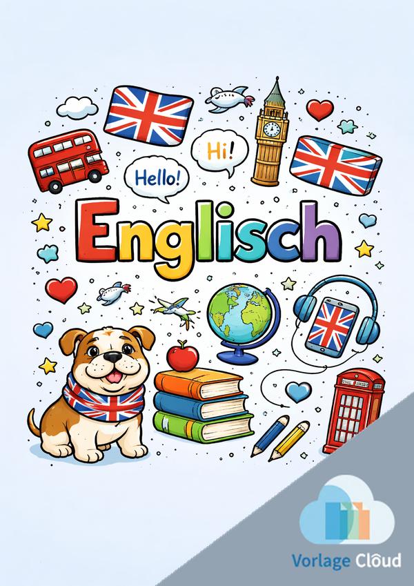 Englisch-Deckblatt im fröhlichen Schulstil mit vielen Symbolen – besonders für Kinder geeignet und sofort druckbereit.