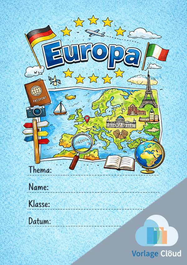 Mit viel Platz für Thema, Name, Klasse und Datum, damit deine Arbeit über Europa besonders ordentlich präsentiert wird.