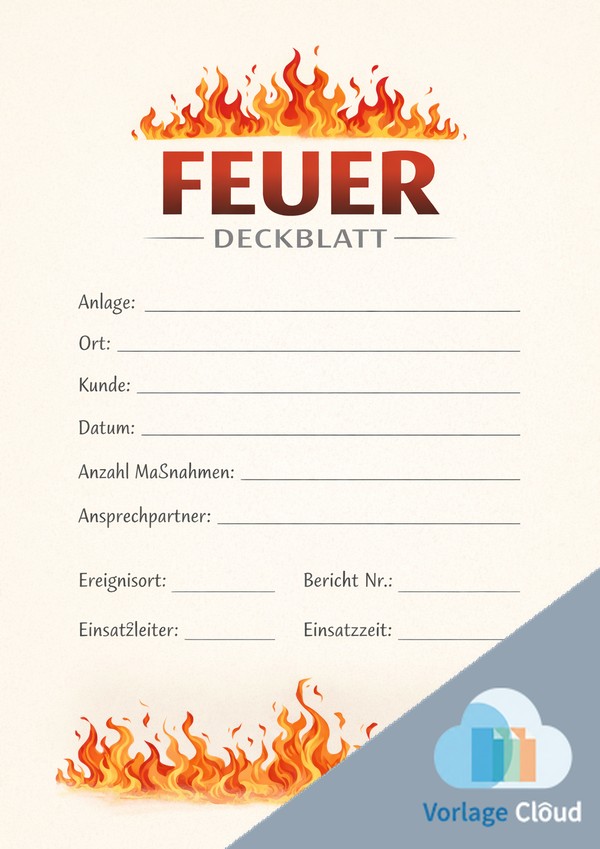 Strukturiertes Feuer-Deckblatt mit Feldern (z. B. Anlage, Ort, Kunde, Datum) – ideal für Berichte & Dokumentation mit Feuer-Thema.
