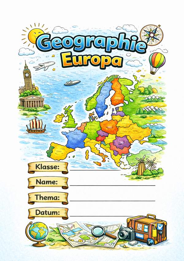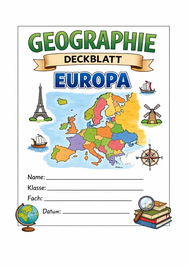 Dieses Geographie-Deckblatt zeigt eine bunte Europakarte und hat Felder für Klasse, Name, Thema und Datum.