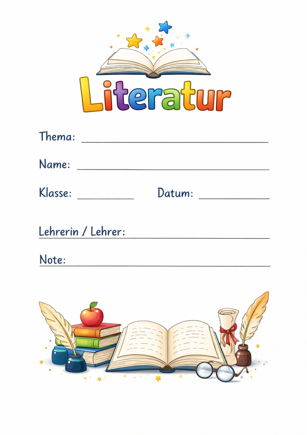Buntes Literatur-Deckblatt mit Bücher und Feder sowie klaren Zeilen für Thema, Name, Klasse und Datum.