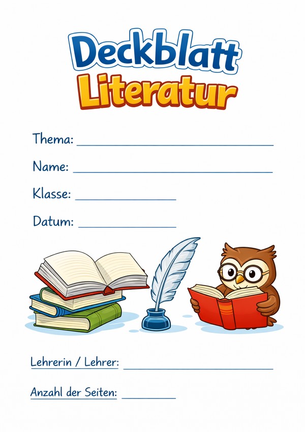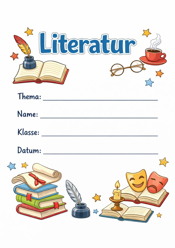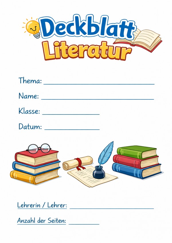 Du suchst ein Deckblatt für Literatur, das du sofort ausdrucken kannst? Hier findest du 6 Literatur-Deckblätter als Bild, PDF und Word – direkt downloadbar, schnell ausfüllbar und ideal für Hausaufgaben, Referate oder Lesetagebuch.