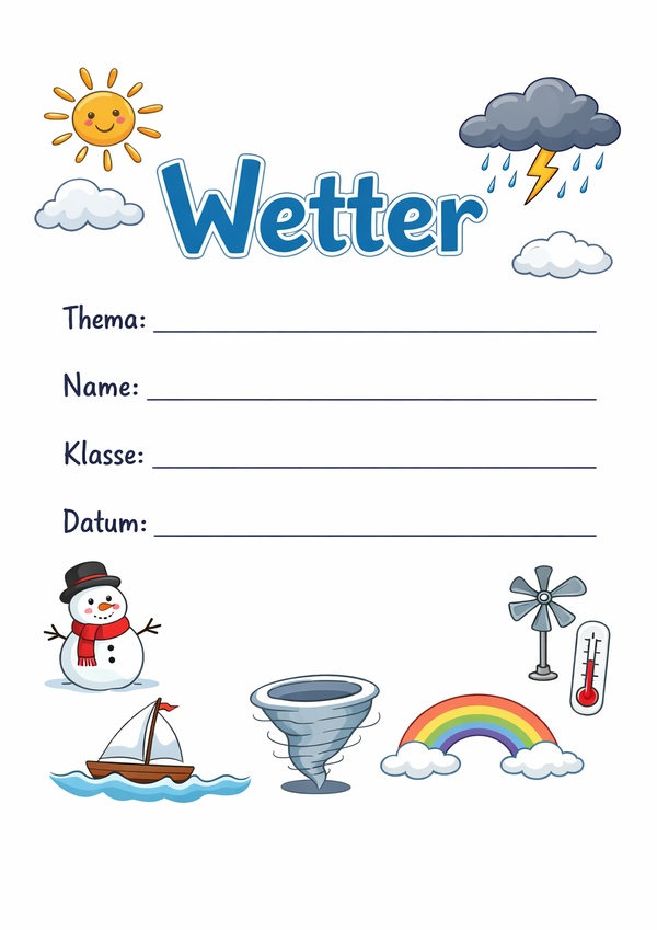 Verspieltes Deckblatt zum Ausdrucken mit kinderfreundlichen Symbolen und Feldern für Thema, Name, Klasse und Datum.