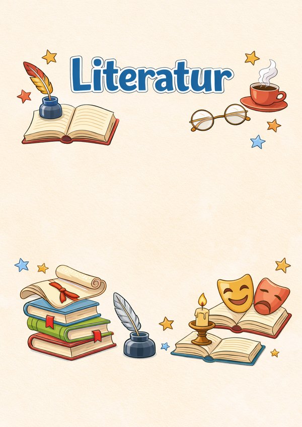 Dekoratives Deckblatt ohne Linien mit Literatur-Illustrationen – ideal, wenn du dein eigenes Layout (Textfelder/Angaben) selbst ergänzen möchtest.