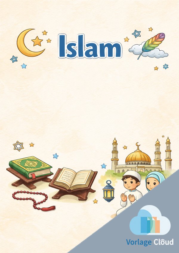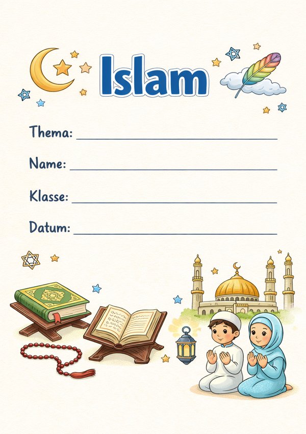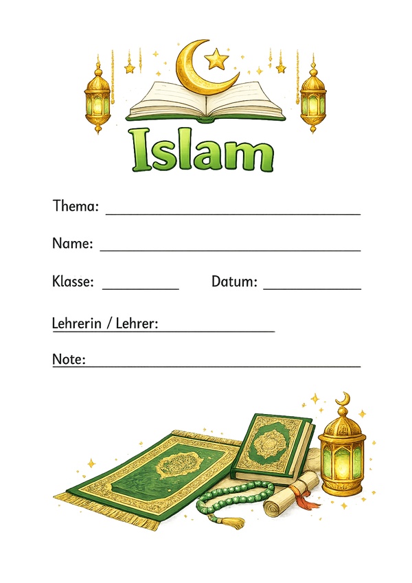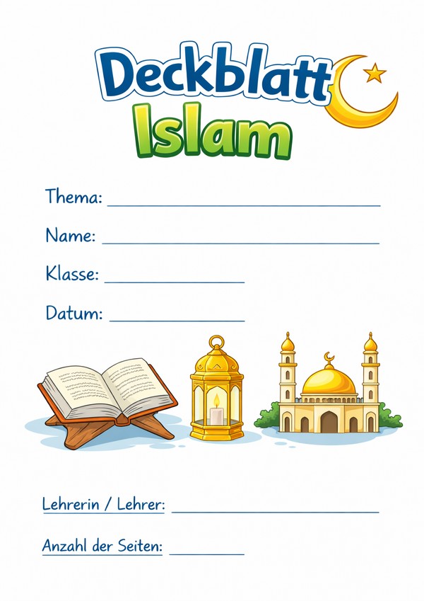 Du suchst ein Islam Deckblatt, das du sofort ausdrucken kannst? Hier findest du 6 islamische Deckblatt-Vorlagen als Bild, PDF und Word – schnell ausfüllbar, druckbereit und ideal für den Unterricht, Referate oder Mappen.