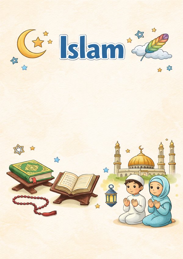 Deckblatt „Islam“ ohne Linien, mit warmem Hintergrund und Illustrationen – perfekt zum Gestalten mit eigenen Texten oder Aufklebern.