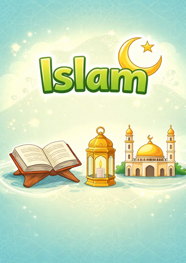 Islam-Deckblatt ohne Schreiblinien mit großem Titel und dekorativer Illustration – viel freie Fläche zum selbst Beschriften.