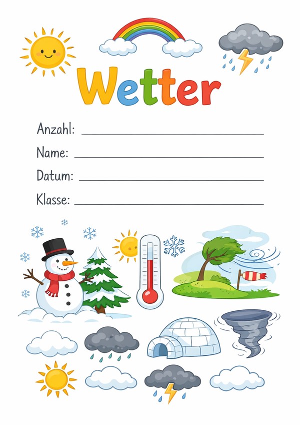 Deckblatt mit Eingabefeldern für Anzahl, Name, Datum und Klasse – mit bunter Wetter-Illustration und viel Platz für Einträge.
