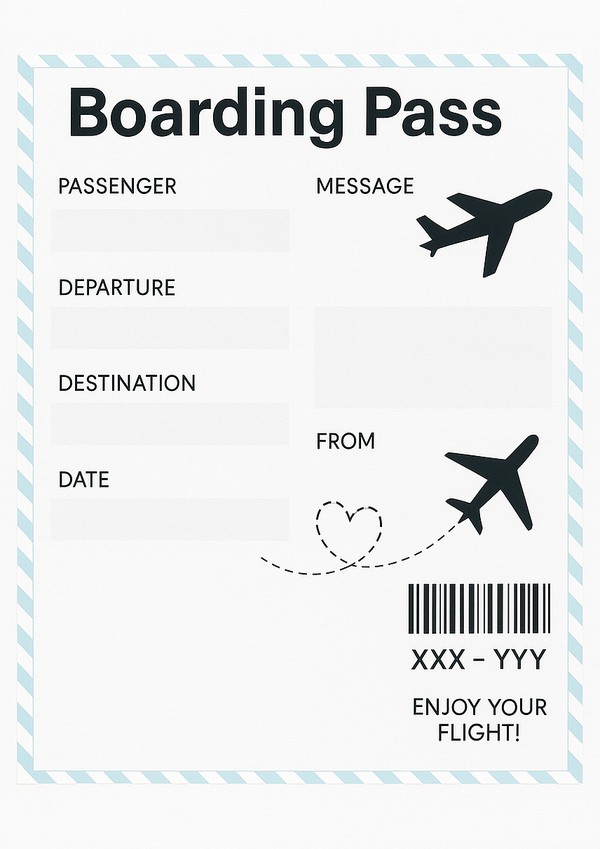 Die helle Boardingpass-Vorlage mit Herzfluglinie ist ideal für Geburtstage oder Überraschungsreisen. Es gibt separate Felder für Passagier, Abflug, Ziel, Datum und eine persönliche Nachricht.
