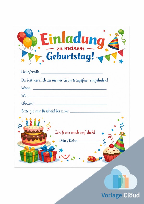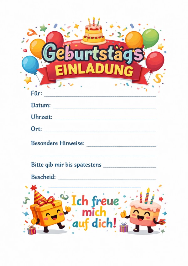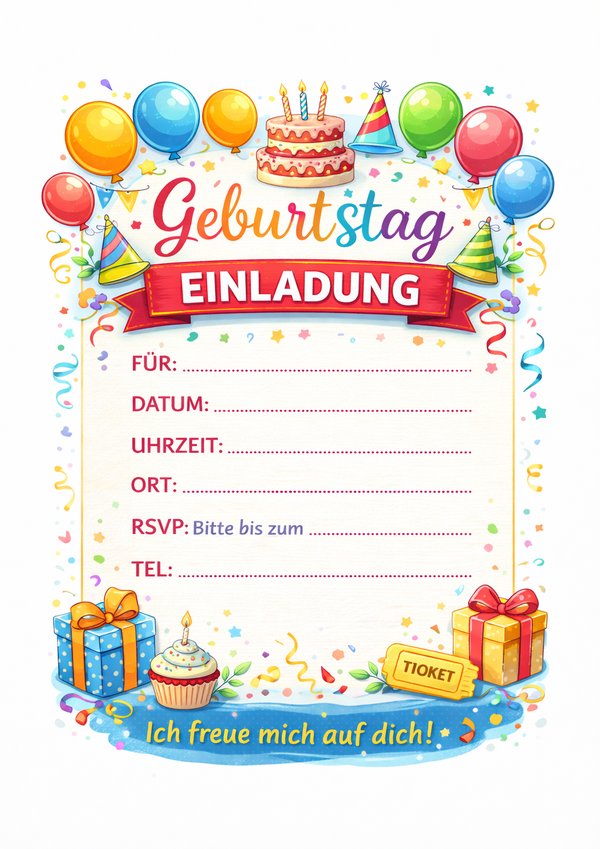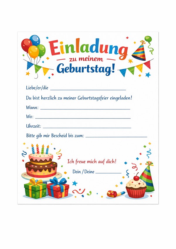 Mit diesen bunten Vorlagen kannst du im Handumdrehen eine fröhliche Geburtstagseinladung gestalten. Einfach herunterladen, ausfüllen und an Freunde oder Familie verteilen – perfekt für Kindergeburtstage und andere Geburtstagsfeiern.
