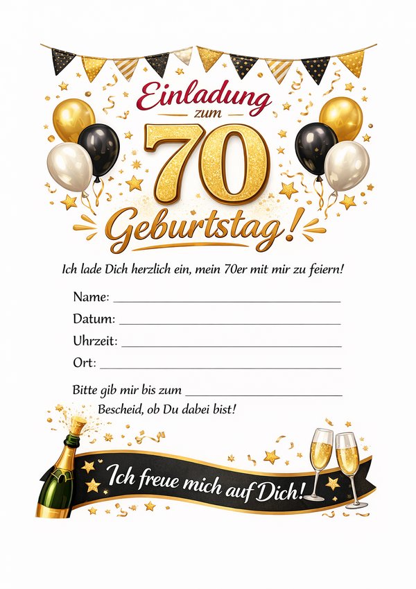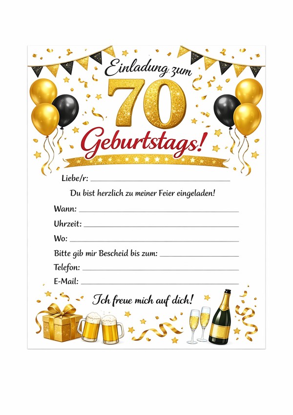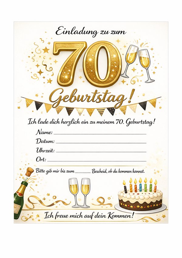 Feierst du bald deinen 70. Geburtstag und möchtest stilvolle Einladungen verschicken? Hier findest du elegante 70 Geburtstag Einladung Vorlagen als PDF und Word, die du sofort herunterladen, anpassen und ausdrucken kannst.