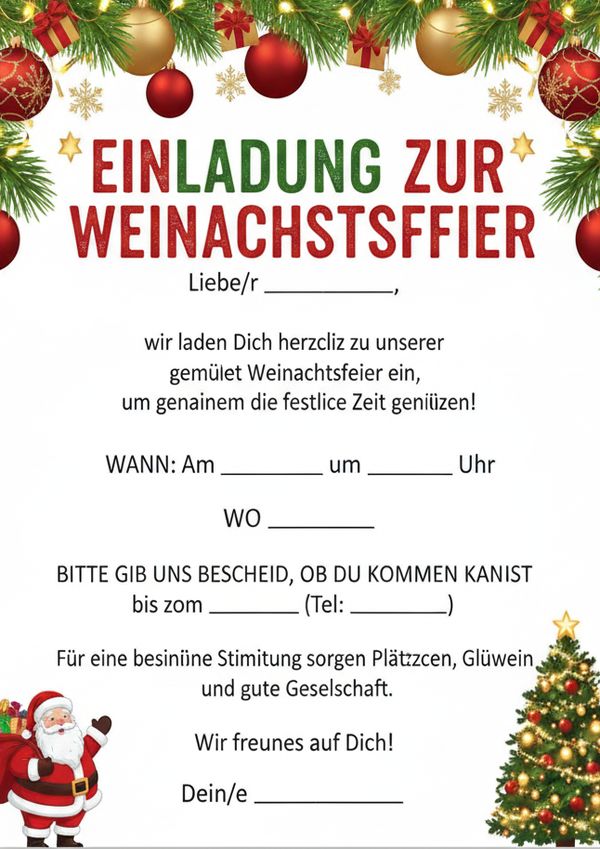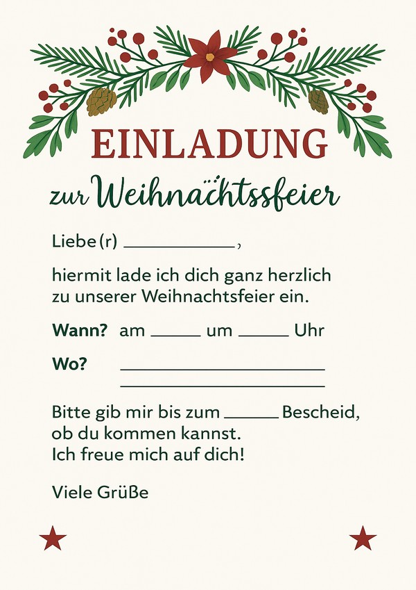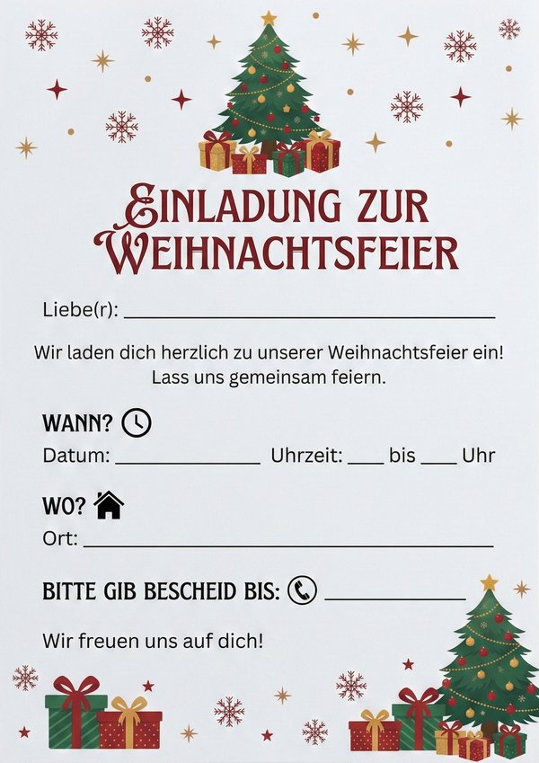 Nutze diese Vorlage zum Beispiel für Nachbarschaftsfeiern, Vereinsabende oder kleine Firmen-Weihnachtsfeiern.