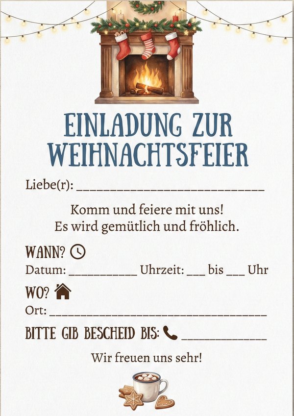 Gemütliche Einladung mit Kamin, Girlanden und Platz für alle wichtigen Angaben zur festlichen Weihnachtsfeier. Ideal für private Feiern in Familie oder Freundeskreis.