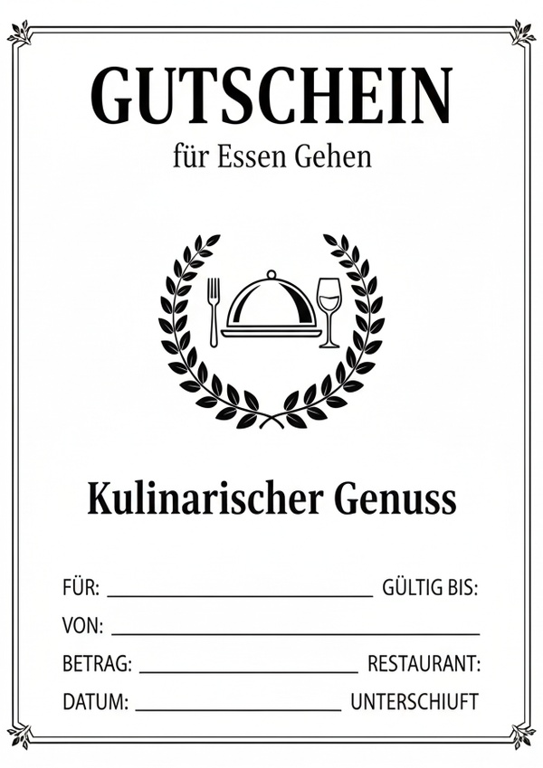 Eine Essensgutschein-Vorlage mit dekorativem Rahmen – ideal, um ein kulinarisches Erlebnis zu verschenken.