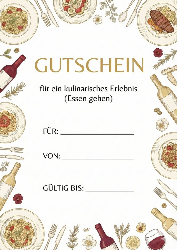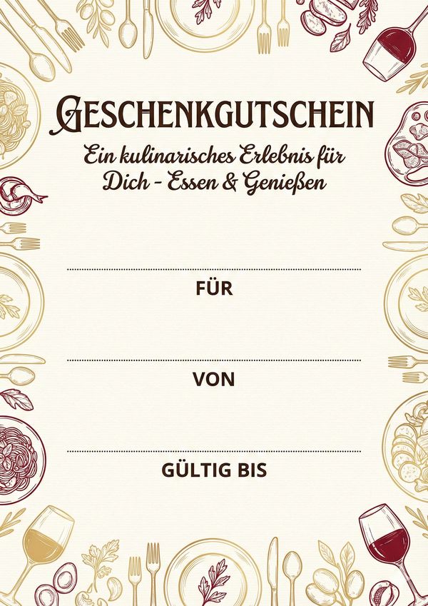 Elegantes Layout mit Essensmotiven – ideal als Gutschein für ein kulinarisches Erlebnis (Essen gehen).