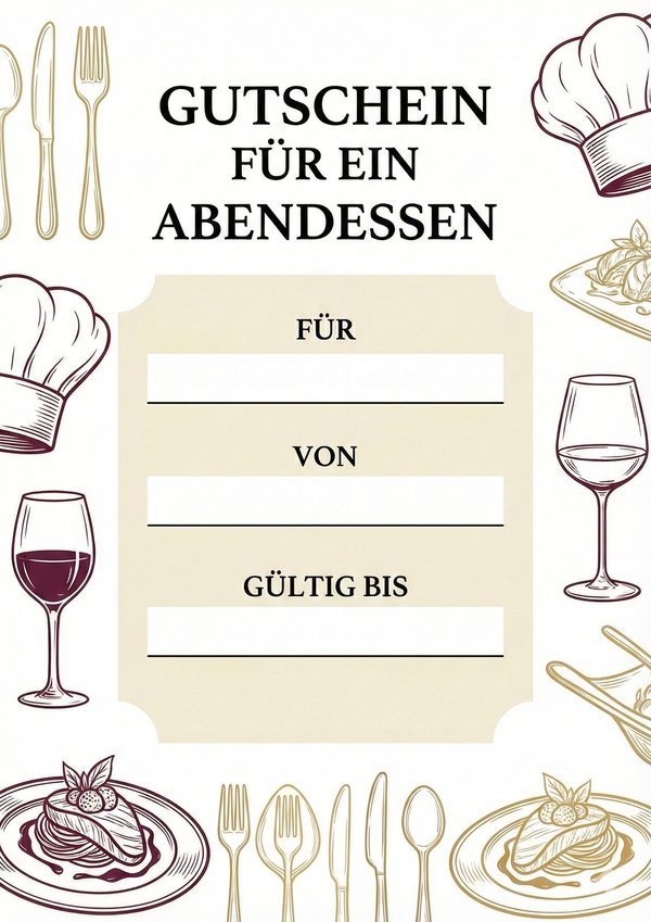Diese Vorlage eignet sich perfekt als Gutschein für ein Abendessen – perfekt zum Ausdrucken und direkt verschenkbar.
