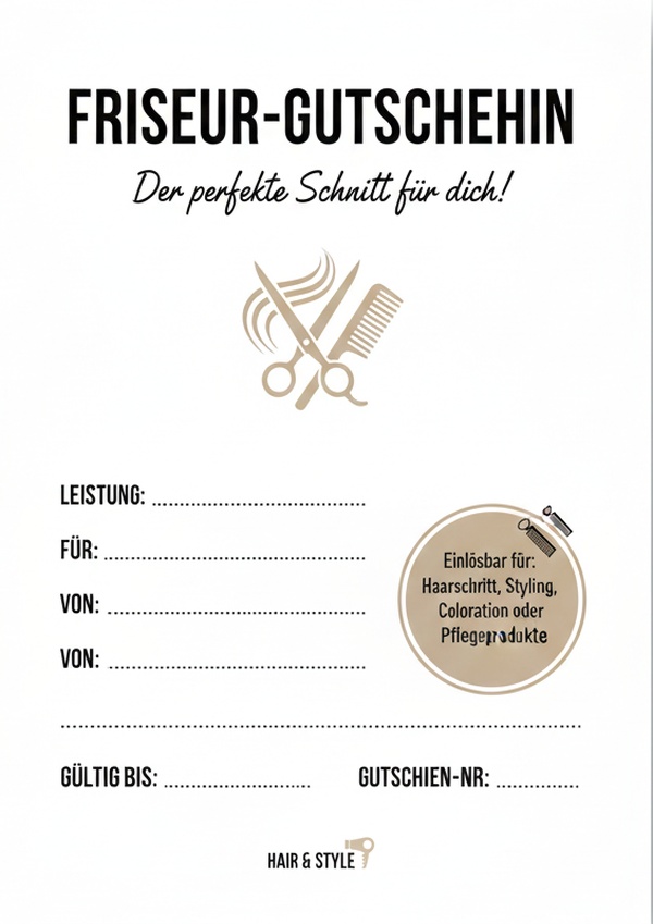 Friseur-Gutschein mit Leistung-Feld und klarer Struktur – ideal für Haarschnitt & Styling als Geschenk.